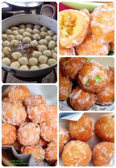 6. จากนั้นนำไปทอดในกระทะน้ำมันด้วยไฟอ่อนประมาณ 10 นาที หรือจนแป้งเหลืองกรอบ ตักขึ้นพักให้สะเด็ดน้ำมัน ตั้งกระทะใส่น้ำตาลและน้ำด้วยไฟกลางค่อนข้างอ่อน (เปลวไฟสูงประมาณ 1 ซม.) เคี่ยวจนเหนียวและเดือดเป็นฟองเล็ก ๆ เต็มกระทะ ใส่ขนมที่ทอดลงคลุกให้เคลือบทั่วก้อน ปิดไฟแล้วคลุกต่อจนน้ำตาลตกผลึกเคลือบเป็นสีขาวทั้งหมดและแห้งสนิท